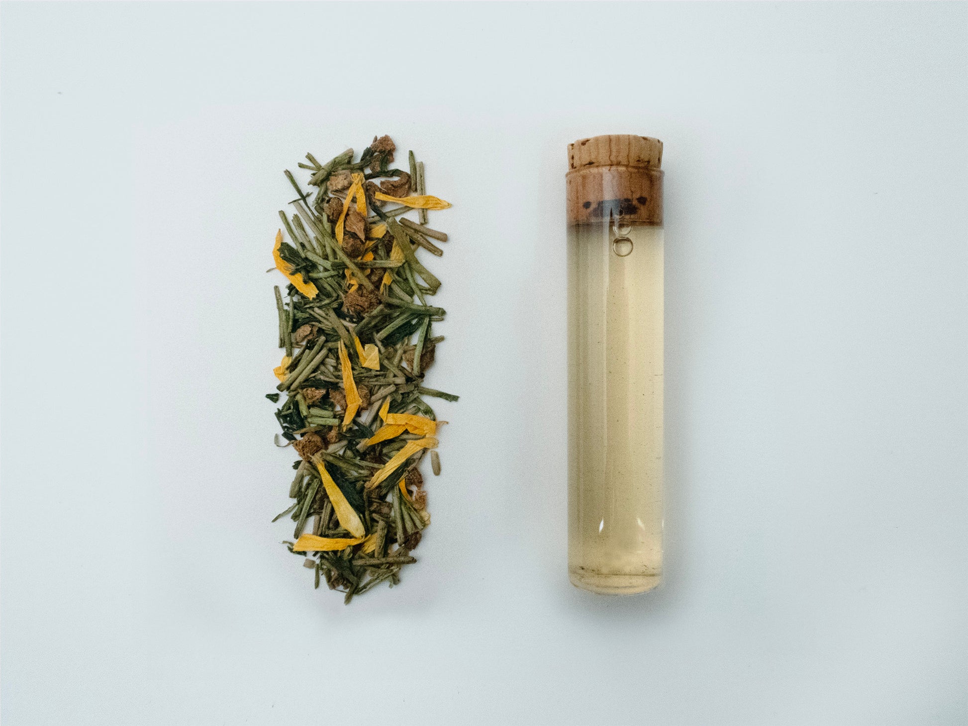 京都府宇治市でつくられた雁ヶ音の焙じ茶に、牛蒡とカレンデュラを合わせました。